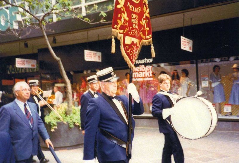 Het Philharmonisch Gezelschap gaf veel concerten in Duitsland. Eind juni 1985 was men in Koblenz. Piet Konings loopt trots voorop door de winkelstraten van Koblenz. Links beschermheer burgemeester Hendrix. |