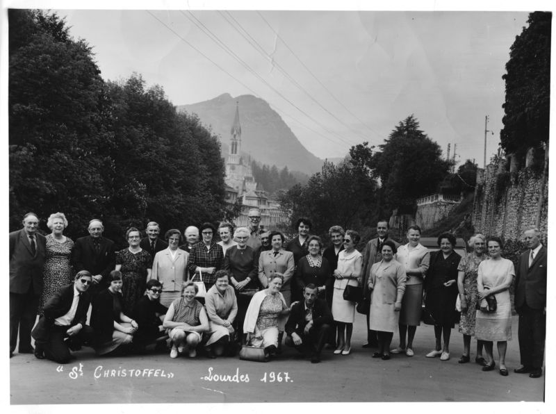 Groepsfoto van een gezelschap dat een reis naar Lourdes maakte met reisorganisatie Sint Christoffel uit Roermond. In dit gezelschap zaten ook enkele Reuverse reizigers. Van rechts naar links: 4 + 5 +11 de dames van der Sterren , 6 Mevr. Geerlings, 10 Mevr. An Geurts - Blomen , 12 Mevr. Janssen - Blomen |