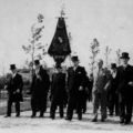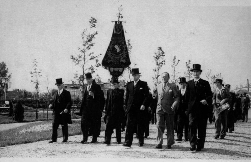 Eind juli 1950 gaf het Philharmonisch gezelschap 2 concerten in Avifauna in Alphen aan den Rijn. Dankzij bemiddeling van Jac Laumans sr. kon men daar terecht. Het corps onderweg. Het bestuur van links naar rechts: Bér Vossen, Sjra Lennaerts sr., Jan Houwers (vaandeldrager), Jan Simons, Van de Brink, zoon van de eigenaar van het park, Eugène Rutten. |