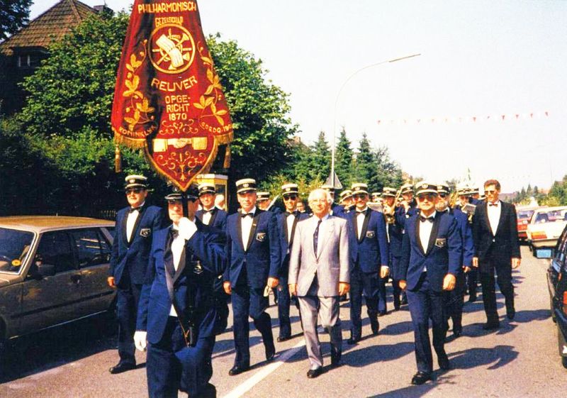 Verenigingen en organisaties | Sinds 1989 (?) neemt het Philharmonisch Gezelschap elke twee jaar deel aan het Schützenfest in Lüttelbracht. Zij neemt deel aan de optocht en geeft daarna een concert in de feesttent. Voorop Toon Strijbos met de drapeau. Daarachter president Louis Heinen. Rechts de nieuwe dirigent Wim Brils. | Lüttelbrachterstrasse | Lüttelbracht (D) | 1989 | ||||