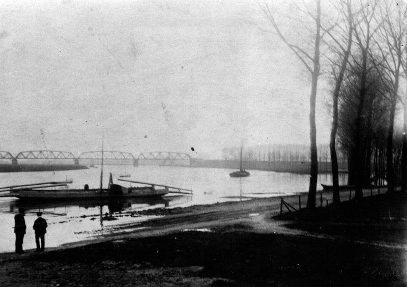 Vervoer overig | Hendrik Smeets was veerman op het veer tussen Asselt en Buggenum en nam daarnaast als beroepsvisser deel aan het visschokken (vissen met behulp van stroom). Op de voorgrond rechts ligt de gierboot van het veer. | Dorpsstraat 100 | Buggenum | |||||