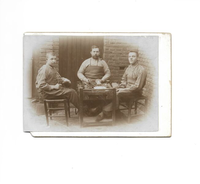 Een meester-schoenmaker met twee leerlingen in 1903. Midden baas Olders, Tegelen, met links leerling Goedgeluk uit Heibloem en rechts Baer Vossen uit Reuver. |