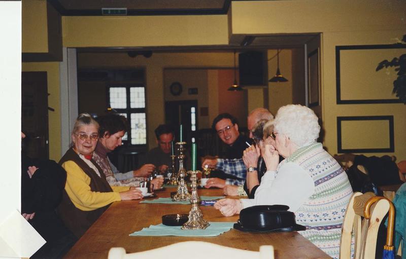 Koffiepauze tijdens het bezoek aan Kevelaer. Links Truus Wuts, Lenie Smeets. Thei Stakenborg. Rechtsachter pastoor Maurice Reneerkens, Henri Smeets. |