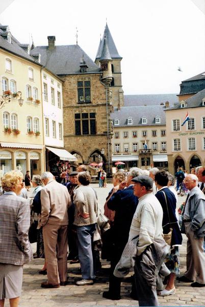 Een excursie van de heemkundevereniging naar het centrum van Echternach in Luxemburg. Op de achtergrond is de Evangelische Basiliek van Echternach te zien. |