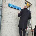 Het plein voor het oude Gemeentehuis werd omgedoopt tot Aaje Glorie-plein. Wim Rovers bevestigt het naambord aan de muur van het Gemeentehuis. |