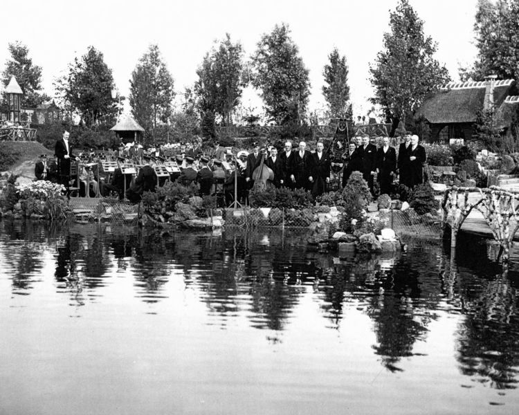 Eind juli 1950 gaf het Philharmonisch gezelschap 2 concerten in Avifauna in Alphen aan den Rijn. Dankzij bemiddeling van Jac Laumans sr. kon men daar terecht. Het corps onderweg. Het bestuur van links naar rechts: Bér Vossen, Sjra Lennaerts sr., Jan Houwers (vaandeldrager), Jan Simons, Van de Brink, zoon van de eigenaar van het park, Eugène Rutten. |