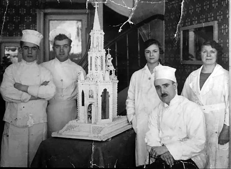 Winkels | Op de foto staat een huzarenstukje van de familie Pubben: een kerk van pepermunt die gemaakt is door Sjeng Pubben (links) tijdens zijn studie voor pasteibakker in Antwerpen. | Antwerpen | 1926 | |||||