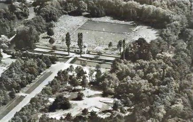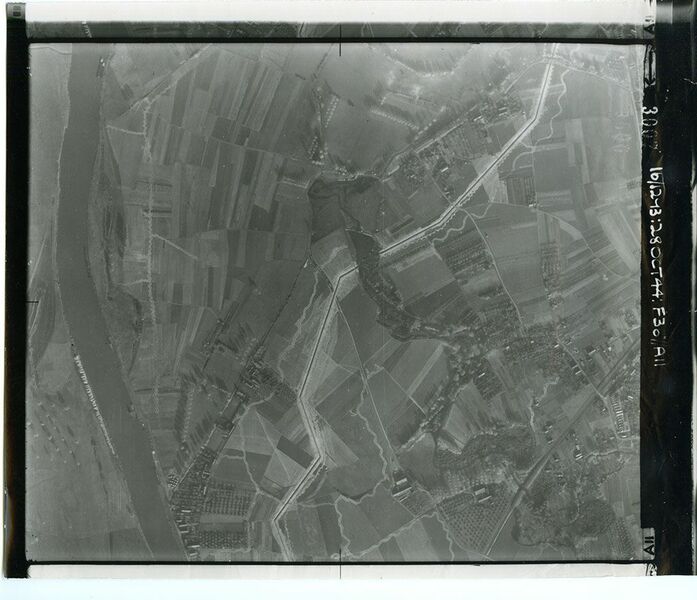 Luchtfoto van de omgeving Wieler in Swalmen. Duidelijk zijn nog de tankgracht en de loopgraven te zien die door de Duitsers zijn gegraven. Tijdens het graven van de tankgracht werd er een fundament gevonden van waarschijnlijk een oude Romeinse villa. |
