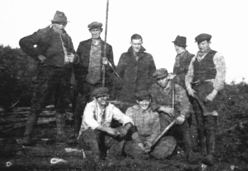 Op de foto zien we werknemers van Jac Laumans mijnhouthandel Reuver. Zij werkten in de bossen en bewerkten boomstammen om te gebruiken als stutten in de mijngangen. Op de foto: links wijdbeens vader Fried Schoeren (Sjoeres-Fried), zoon Wiel Schoeren staand rechts met bijl, zoon Coen Schoeren zittend midden op de foto. De man staand midden op de foto is vermoedelijk de opzichter. De overige mannen zijn waarschijnlijk afkomstig uit Swalmen. |