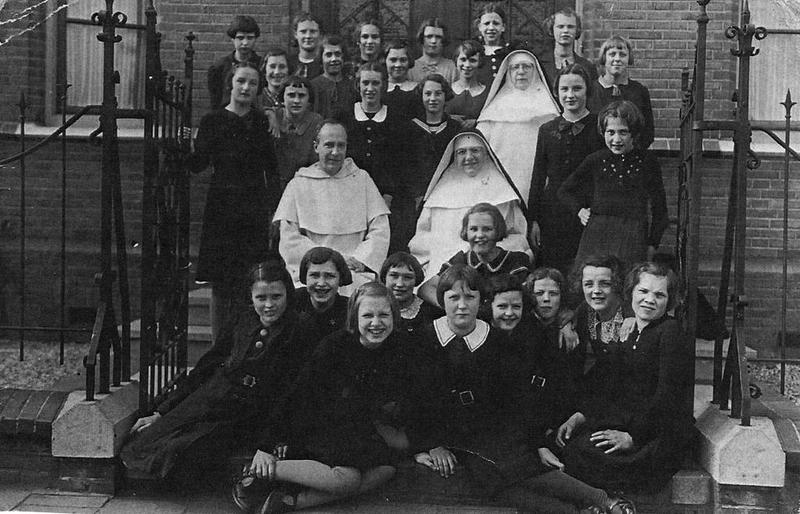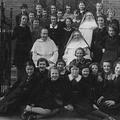De hoogste klas van de meisjesschool. De foto werd genomen voor de hoofdingang van het klooster in Reuver. Op de foto staan van links naar rechts; Bovenste rij: 1 NN, 2 NN, 3 Loes Teunissen, 4 Rutten , 5 Holtkamp, 6 Koek. 2e + 3e rij: 1 Dorssers, 2 Smolenaars, 3 Riet Kleijne, 4 Boodt ??, 5 NN, 6 NN, 7 Riet Julicher, 8 NN, 9 zuster Cleta, 10 NN, 11 Lenssen Zittend: 1 Rector , 2 Zuster?? Zittend: 1 Simons, 2 Muisenberg, 3 Riet Bouten , 4 Annie Neuen, 5 NN, 6 Zus Strous, 7 NN, 8 Jet Vul Meer ... |