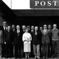 Het personeel van het postkantoor uit Reuver en Belfeld, hier gefotografeerd voor het postkantoor in Tegelen. Van links naar rechts: 1 NN, 2 Lamers (directeur Reuver), 3 Harie Claessen 4 Jo Peeters,5 NN (directeur Belfeld), 6 Piet Beijck, 7 Mien van Wylick, 8 H Crins, 9 NN, 10 Geert Driessen, 11 Thei Vullers 12 Wiel Aspers, 13 NN 14 Landewee. |