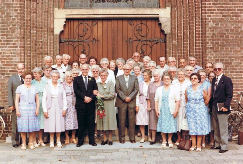 Het 50-jarig huwelijk van Wim Huibers en zijn vrouw Huibers - Kusters samen met het ouderenkoor van Reuver. De foto is genomen voor de Lambertuskerk in Reuver. van links naar rechts; 1ste rij: 1 Mevr. Hillekens, 2 Mevr. Sloezen, 3 Mevr. Jacobs, 4 Wim Huibers, 5 Mevr. Huibers-Kusters, 6 Bobby Helwegen, 7 Mevr.Samang, 8 Mevr. van Willick, 9 Mevr. Geerlings, 10 NN, 11 Mevr. Goertz. 2de rij: 1 Wiel Sloezen, 2 Mevr. Klerks, 3 Dhr. Klerks, 4 Mevr. Houwers (staat achter Wim), 5 Mevr. Barkhof, 6 Meer ... |