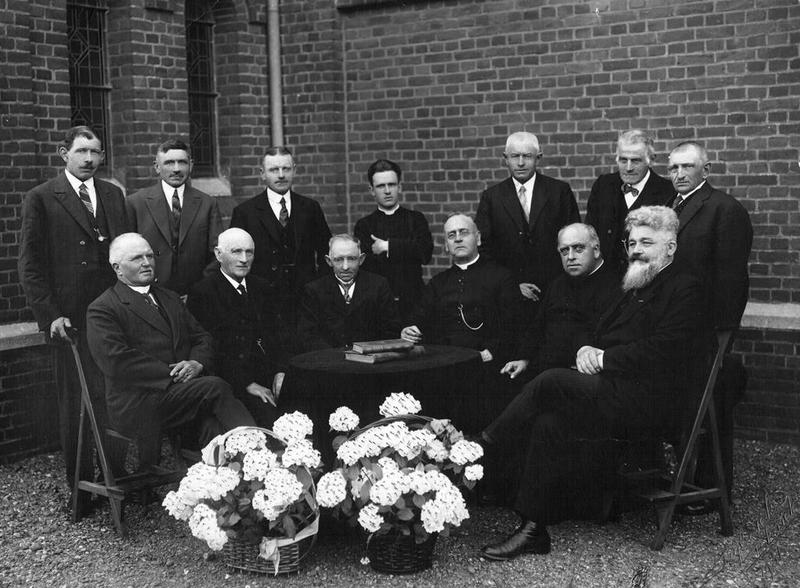 Het bestuur van de Boerenleenbank in 1931. Van links naar rechts, zittend: Graat Hoezen, Wullum Hoezen, Piet Kurstjens, Pastoor Hermens, rector Bongaerts (uit Roermond). staande: Frans Geraets, Leo van de Munckhof, Willem Boonen, kapelaan Spee, Kuéb Smeets, Wijnand Driessen, Jac. Rijs. |