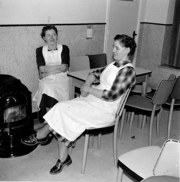 Diversen | Mina en Anny Maassen warmen zich in de keuken aan de kachel. | Rijksweg zuid 3 | Belfeld | 1960 | ||||