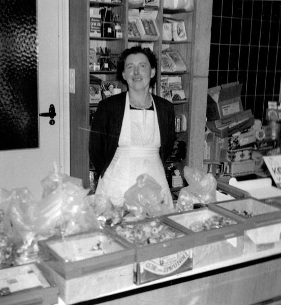 Winkels | Mina Maassen achter de toonbank in hun winkel aan de Rijksweg in Belfeld. | Rijksweg zuid 3 | Belfeld | 1960 | ||||