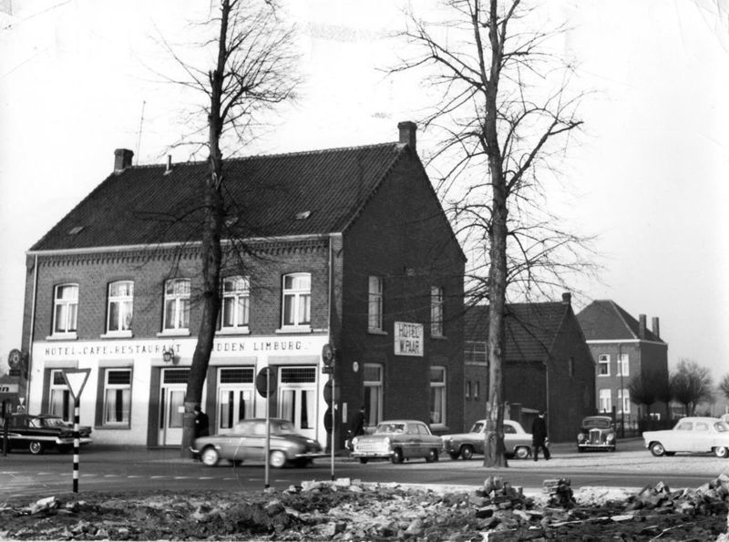 Hotel - café-restaurant "Midden - Limburg" in 1952. Eigenaar was destijds Wim Paar. Het gebouw werd in 1980 afgebroken. Op de achtergrond zien we de oude pastorie aan de Urbanusweg. |