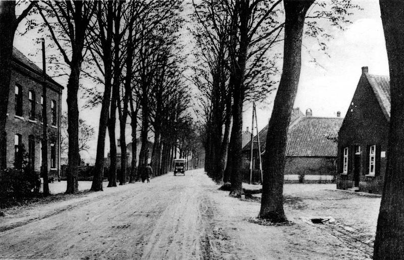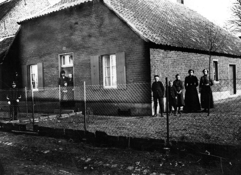 De boerderij van de familie Engelen aan de Rijksweg In de deuropening Willem Engelen met dochter Fientje en vrouw Han Engelen. Rechts Sef Engelen, Wiel Engelen, Ciel Engelen. Truu Engelen en Mina Engelen. |
