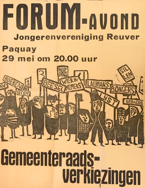 Verenigingen en organisaties | Affiche FORUM-avond ter gelegenheid van de gemeenteraadsverkiezingen in 1970. De avond werd georganiseerd door de Jongerenvereniging en vond plaats in zaal Jo Paquay. Affiche is een linosnede gemaakt door Ton Verlijsdonk (AV) en gedrukt bij TIM's Drukkerij. | Rijksweg 18 | Reuver | 1970 | ||||