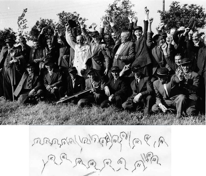 Een foto uit 1936, tijdens het toen gehouden OLS in Grathem, waar Schutterij St Georgius en St Sebastianus Schutterij uit Beesel het OLS won. Op de foto zien we o.a. dr. Crasborn (nr.10) in het middelpunt van de feestvreugde. 1. Paul Levels, 6. Piet Simons (buksmeester met witte jas), 7. Sjra Spee?, 8. Pierre Peeters, 10. Dr. Harrie Crasborn,11. Toon Heinen, 12. ... Janssen (van de köster),15. Jan van der Borst, 16. Jacques Nijssen, 17. Toon Smeets,18. Jeu Smeets,19. Sjeng Geerlings, 20. Maan C Meer ... |