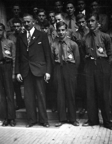 Het bestuur van de Jonge Werkman Vereniging op de Vleesstraat in Venlo (1938). Van link snaar rechts: Chris Janssen, Herman Verlaer, Pauw Timmermans, Tinus van Bommel (was 40 jaar voorzitter). |