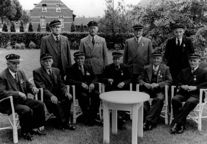 In 1956 had schutterij Urbanus 10 gouden jubilarissen. De foto is gemaakt in de tuin van Hotel - Café - Restaurant Midden Limburg van Wim Paar aan de Rijksweg. Op de foto van links naar rechts, Zittend: Thei Hoezen, Peter v.d. Biesen, Jac Peeters, Gerard Linssen, H. Peeters, Hens Smeets. Staande: Wullum Ummenthum, Hens Ummenthum en Graat Goossens. |