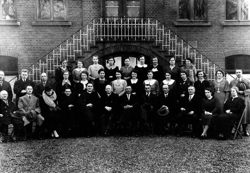 Leerkrachten en leerlingen van de huishoudcursus bij zaal "Verdonk" (tegenwoordig 't Bergske) in Belfeld uit 1936. De foto is genomen vóór het oude gemeentehuis Op de foto staan van links naar rechts, zittend: Hover (leraar uit Baarlo), P. Dings, Mevr. Harbers, Ch. Jonkers, kapelaan Bemelmans (priester uit Roermond), Driessen, P. Kurstjens, H. Hendriks, Sj. Goossens, W. Boonen, mevr. Vissers (lerares uit Roermond) en mevr. Bakenhof (lerares uit Roermond). Eerste rij: L. v.d Brugh, M. Hegger Meer ... |