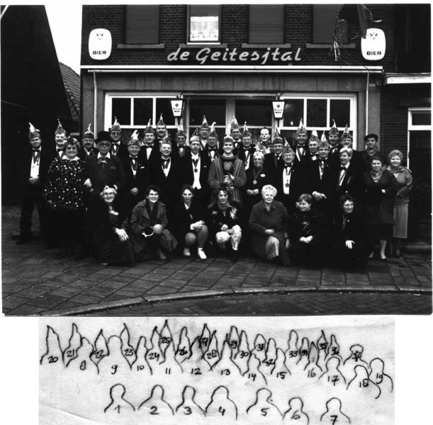 Groepsfoto van het VV Hopsjlokkersgezelschap uit 1989, met prins Fons I. De foto is genomen voor de Geitesjtal in Swalmen. De namen van de personen zijn: 1 Lies Boerma-Westheim, 2 Jo Simons- Hendriks, 3 Lia van den Groenendal-Claessen 4 Peggy Geraedts-Puper, 5 Riek Wijnands-, 6 Fien Claessen-Vergeer, 7 Nelly Beek- 8 Annie Mertens-, 9 Bert Thijssen, 10 Cor Wijnands , 11 Wim Lenssen, 12 Wim Evers, 13 prins Fons Geraedts, 14 Gien Allers-Surminsky (Regina interra), 15 Pierre Mertens, 16 Huub Ve Meer ... |