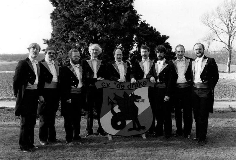 Onder het motto "Beesel wie 't laef" werd de carnaval in 1986 ingeluid door C.V. "de Drake". van links naar rechts: Frank Rous, Piet v.d Körver, Ton Claessen, Jan Ottenheim, Herm Schoeren, Dré Cruisberg, Emiel Rutten, Pierre Heinen en Coen Schoeren. |