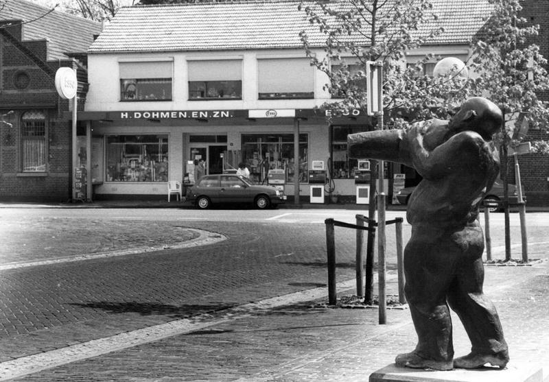 De Windjse Windjbuujel, het symbool van de Reuverse vasteloavesvereiniging De Windjbuujels, voor het gemeentehuis in Reuver. Op de achtergrond is nog het tankstation en de winkel van Dohmen te zien. |