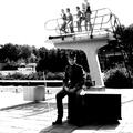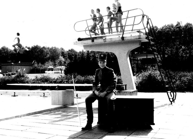 Stichting Toneelgroep Reuver. Ton Dohmen poseert op een oude dekenkist die te koop was tijdens de grote rommelmarkt ter ere van het 60-jarig bestaan van de toneelgroep, op het terrein van zwembad "De Berken". |