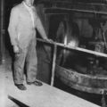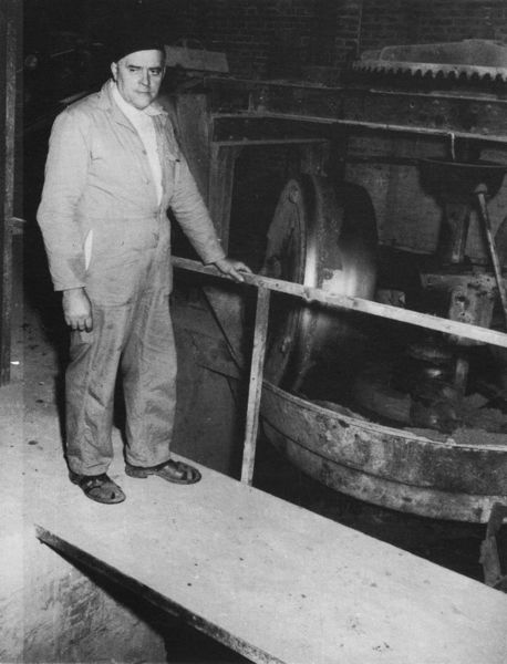 Fabrieken / Bedrijven | Sjra Geijzen bij de kollergang van gresbuizenfabriek Teeuwen. | Heytstraat | Offenbeek | 1957 | ||||