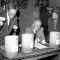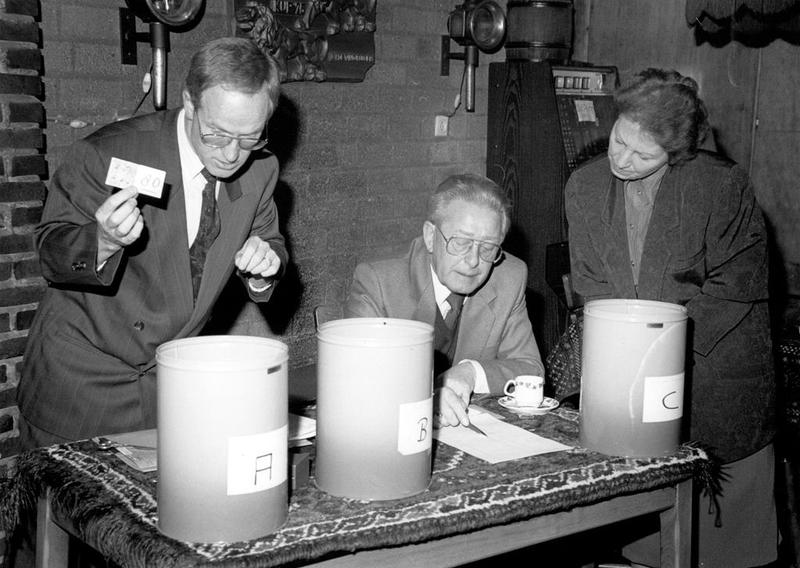 De Reuverse Orkest Vereniging R.O.V. Trekking van de R.O.V.-Loterij in "de Haam" door notaris van Lier. Rechts Mia v.d. Munckhof en in het midden Sjra Vintcent. |