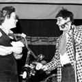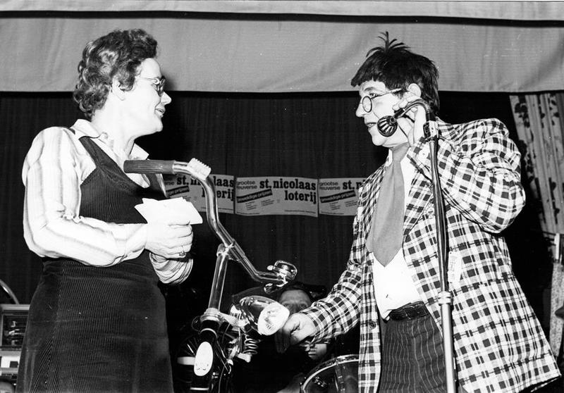 Sint Nicolaas actie van de Reuverse Middenstand. Buutreedner Pierre Knoops presenteert deze avond en reikt een prijs uit aan mevrouw Paula Geraedts - Vossen. |