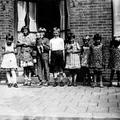 Deze jeugd staat vóór het huis van Lenssen aan de grens. Van links naar rechts: Mia Dewinden, Tila Lenssen, Fien Lenssen, Frans Erdkamp, Tony Lenssen, Joke Lenssen, Elvira Erdkamp en Margriet Erdkamp. |