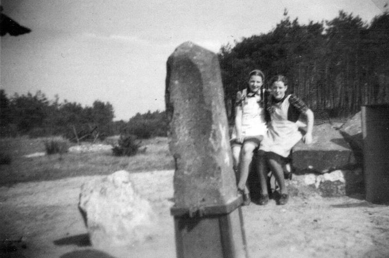 Diversen | Mia Dewinden en Doortje Lankes bij de grenspaal aan de Witte Steen. Links de echte Witte Steen. Rechts de weg naar Potsdammer Platz. | Keulseweg 202 | Offenbeek | 1943 | ||||