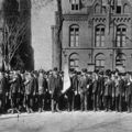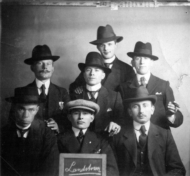 De Landstorm in de jaren na de Eerste Wereldoorlog. Op de foto staan: Beneden geheel links: Sjang Metsemakers, tweede rij links Stevens (uit Rijkel), midden Piet Huijbers (van de wasserij aan de Wilhelminalaan) en geheel boven Kuüb Vullers (deze had een sigarenfabriekje aan de Wilhelminalaan toen nog Spoorstraat geheten). |