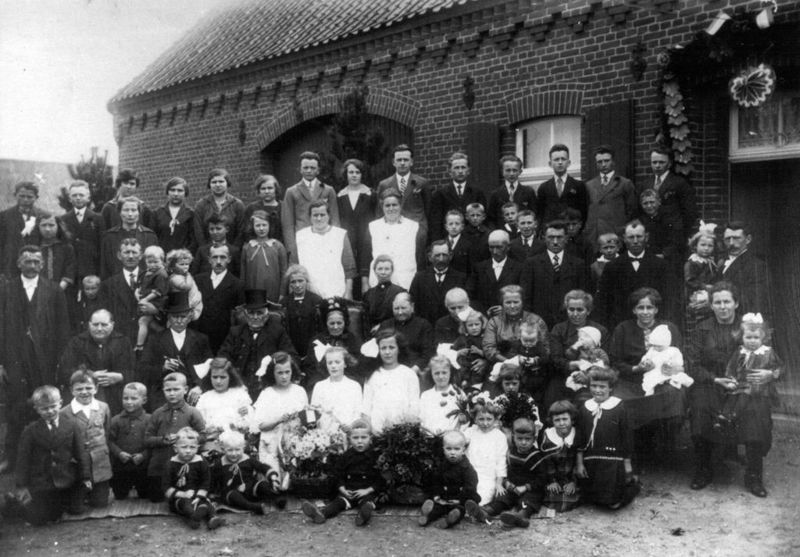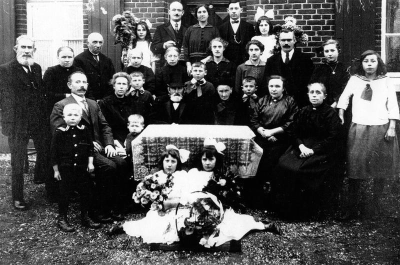 Familiefoto van de familie Johan Bors en Anna Bors - Stinges bij de gelegenheid van hun 50-jarig huwelijk. Op de foto staan van links naar rechts: Eerste rij (zittend) : Blom Bors (dochter van Herm Bors), Jan Bors (dochter van Herm Bors). Twee kinderen voor de tweede rij: Paul Levels en Ben Levels. Tweede rij: Hubertus (Thies) Levels, Wies Levels - Bors (vrouw van Thies), Thei Levels, Johan Bors, Sjeng Levels, Anna Stinges, Wiel Levels, Catharina Wassen - Bors (vrouw van Ben), Maria Bors Meer ... |