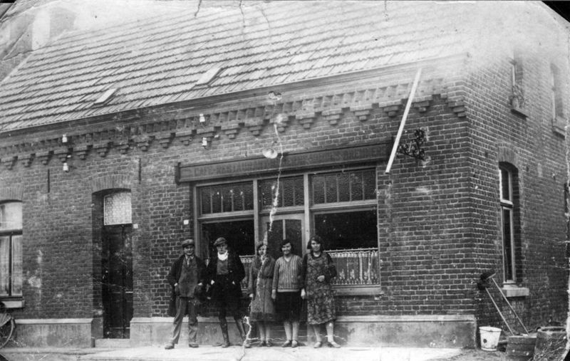 Café Restaurant Simons-Bremmers aan de Keulseweg (later van Sjra en Marie Theunissen-Simons). Op de foto staan van links naar rechts: Bernard Bremmers, Wim van Eyck, Leen Peeters, Marie Simons en Mien Simons - Bremmers. |