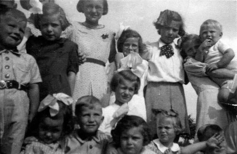 Als kinderen uit één familie, zo staan ze gezellig bijeen op deze foto uit 1940. Allemaal kinderen uit de Emmastraat in het eerste jaar van de oorlog. Van links naar rechts: Staande: Piet Ebus,Sina Berkers, Wies Litjens, Berkers, Mia Killaars, Lenie Smeets en Jan Smeets. onderste rij: Jo Litjens, Wiel Ebus, Mies Wolters, Mariet Berkers, Mia Smeets en Pierre Wolters. |