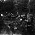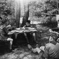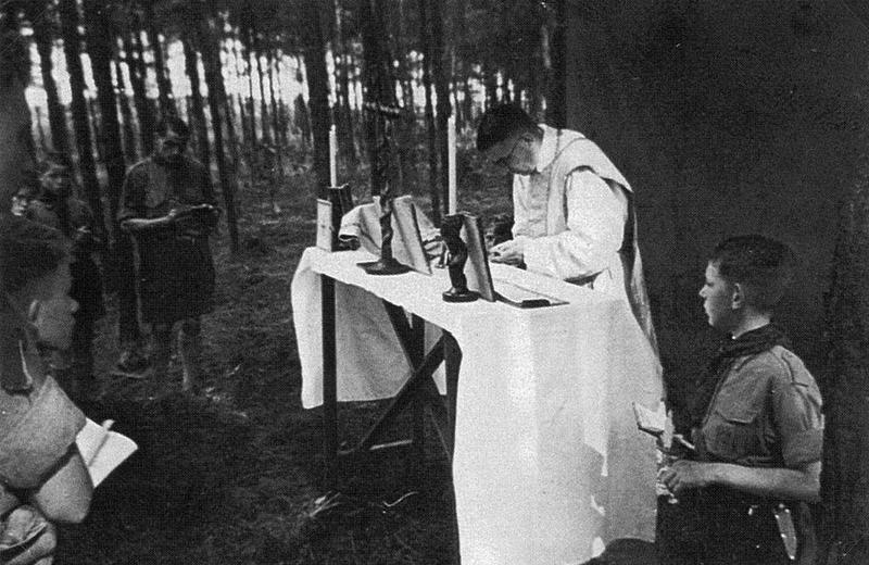 De verkennersgroep Sint Lambertus uit Reuver begin jaren vijftig op zomerkamp in Helenaveen. Op de foto wordt er een mis opgedragen in het bos door kapelaan Delhoofen. |