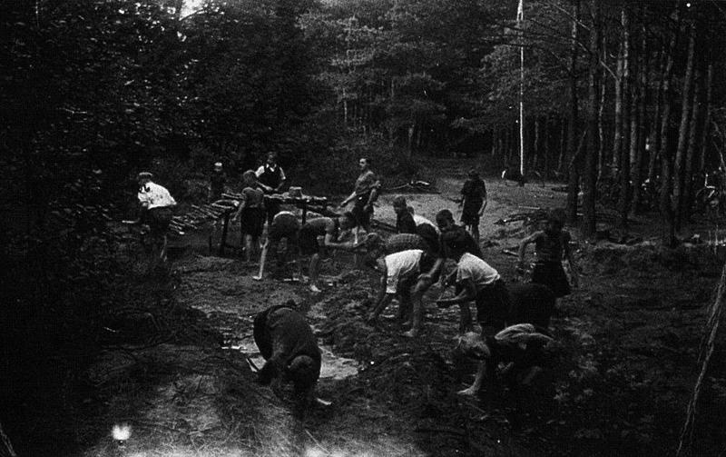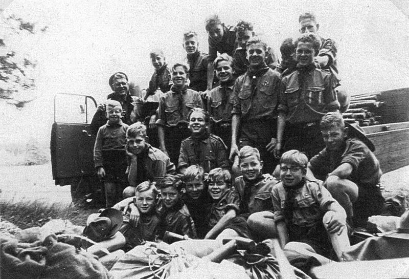 De verkennersgroep Sint Lambertus uit Reuver in begin jaren vijftig op zomerkamp in Helenaveen. Op de foto staan: Boy Dohmen, Broer Verlinden, Dre Schrijvers, Pierre Teunissen, Fons Verdonck, Gerrie Blomen, Dré Teunissen, Jan Thijssen, Jan Teunissen, Lot Zegers, Frans Lennaerds, Cor Apeldoorn, Wijnand Blomen, Jack v.d. Pot, Herm Rutten en Joep Backus. |