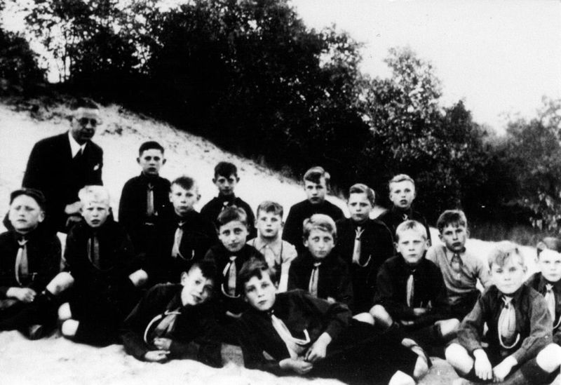 De jonge Wacht omstreeks 1940. Vierde van rechts Frans Schoeber en zesde van rechts Dré Vincent. |