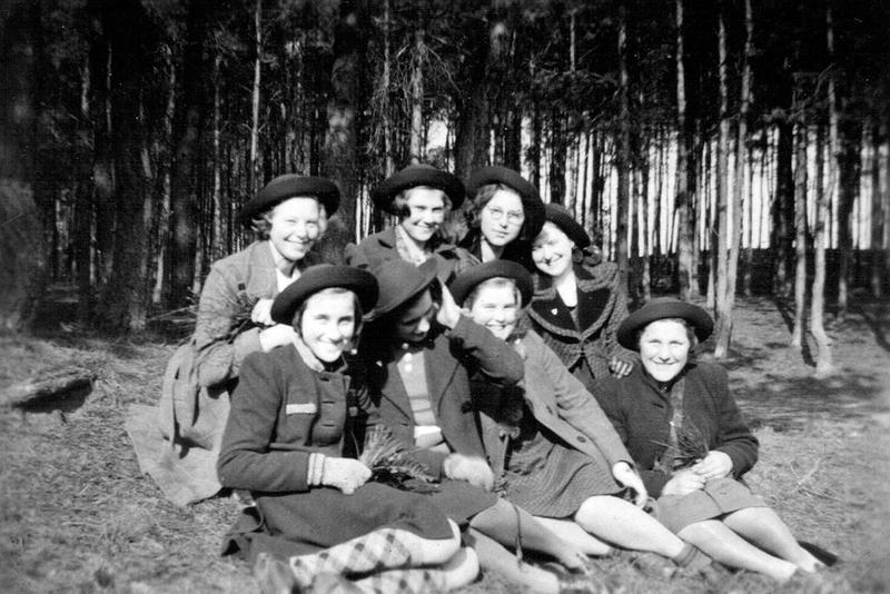 De Kroongroep van de Katholieke Jonge Meisjes Reuver gefotografeerd in de Reuverse bossen. Van links naar rechts: Bovenste rij: Mia Beeurskens, Nellie Franssen, Mien Beurskens en Mia Peeters. Beneden: Riet Kleijne, NN, Mia Goertz en Jeanne Thijssen. |