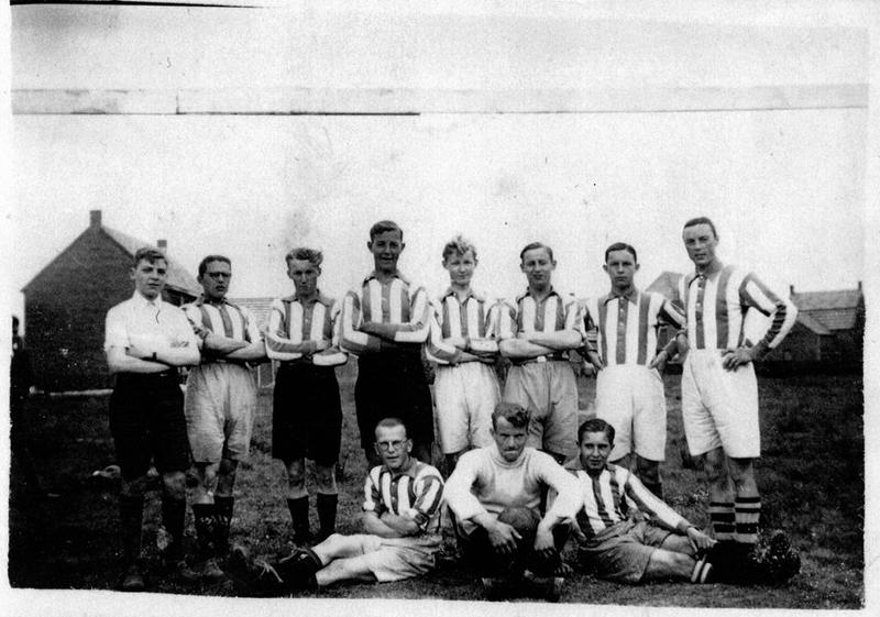 Voetbalclub Blauw Wit speelde hun wedstrijden op het braakliggend terrein tussen de Prins Hendrikstraat en de toenmalige Groenstraat. Op de foto staan van links naar rechts: bovenste rij: Mathieu Vossen, Harrie Janssen, Jeu Theeuwen, Jan Heldens, Martin Gijzen en Leo Nottelman. midden geknield: Fons Verstegen, Wim Huibers en Piet Heldens. zittend: Jo Kleijne, Jan Lankes en Herman Thijssen |