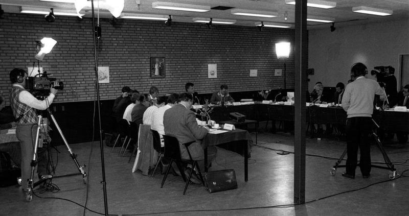Een lokale televisie uitzending van een gemeenteraadsvergadering. |
