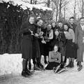 Schaatsen op de gracht bij kasteel Hillenraad. Op de foto zien we van links naar rechts: bovenste rij: Herman Teeuwen, Marthe Teeuwen, Jac Vroemen, Jo Thijssen, Mia Teeuwen, Jo Teeuwen en Nellie Teeuwen. Op de 2e rij: Anneke Heldens, Grada Teeuwen, Maria Goossens, Toos Goossens en Lies Teeuwen. gehurkt: Baer Heldens |