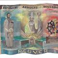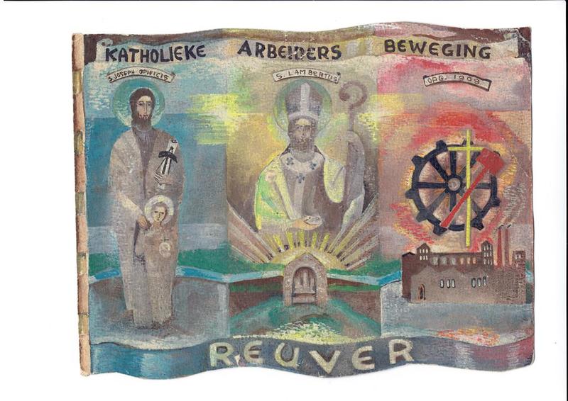 Ontwerp van het vaandel van de Katholieke Arbeiders Beweging afd. Reuver. Het was de opvolger van de in 1909 opgerichte "Willibrordusvereniging" voor fabrieksarbeiders. Het vaandel werd door de Reuverse bevolking aangeboden vanwege het 50-jarig jubileum. Ontwerp van Ella Sliedrecht |