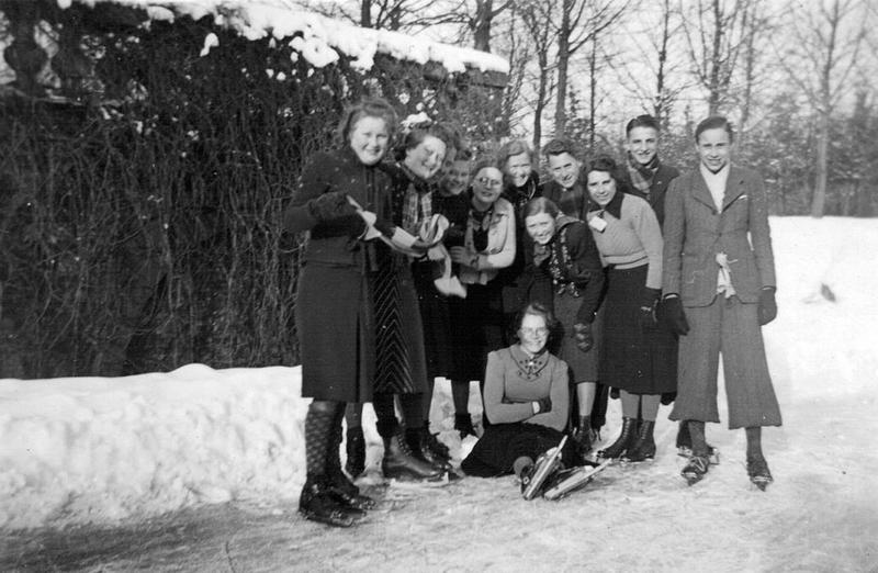 Schaatsen op de gracht bij kasteel Hillenraad in Swalmen. Op de foto zien we : Jo Teeuwen, Toos Teeuwen, Martha Teeuwen, Mia Teeuwen, Maria Goossens, Toos Goossens, Herm Thijssen, Jo Thijssen, Anneke Heldens en Baer Heldens. |