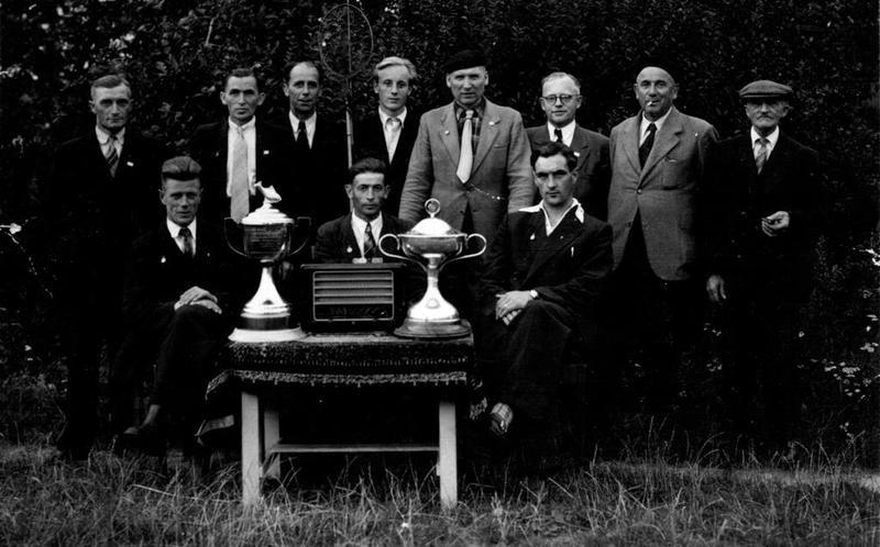 Leden van hengelsportvereniging HSV De Forel met hun gewonnen bekers tijdens een wedstrijd in Swalmen. Op de foto staan van links naar rechts: Sjra Timmermans, Frens Timmermans, Rein Achten, Jeu Dewinden, Sjaek Hermans, Drees Hermans, Bert Peeters en Leike Timmermans. Zittend: Harrie Litjens, Wim Wijnands en Lei Cremers. |