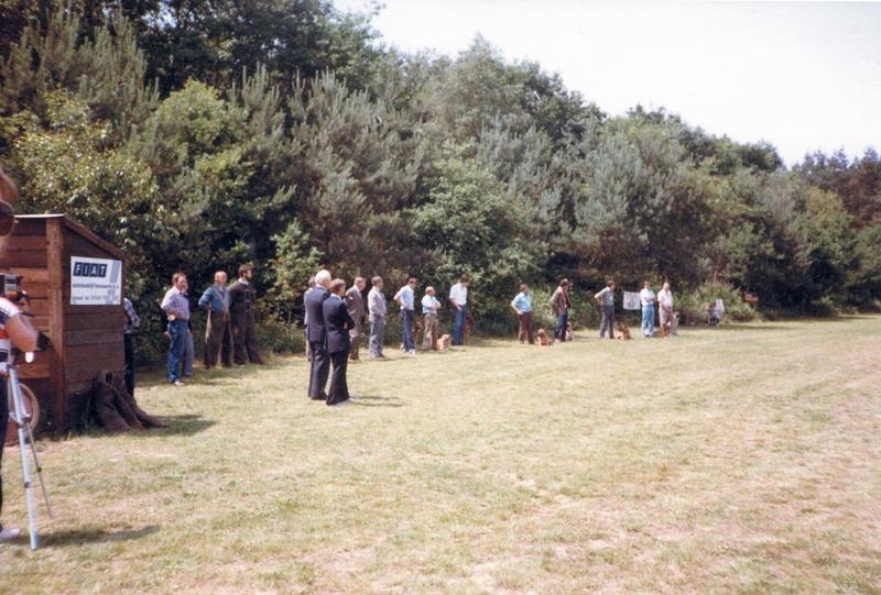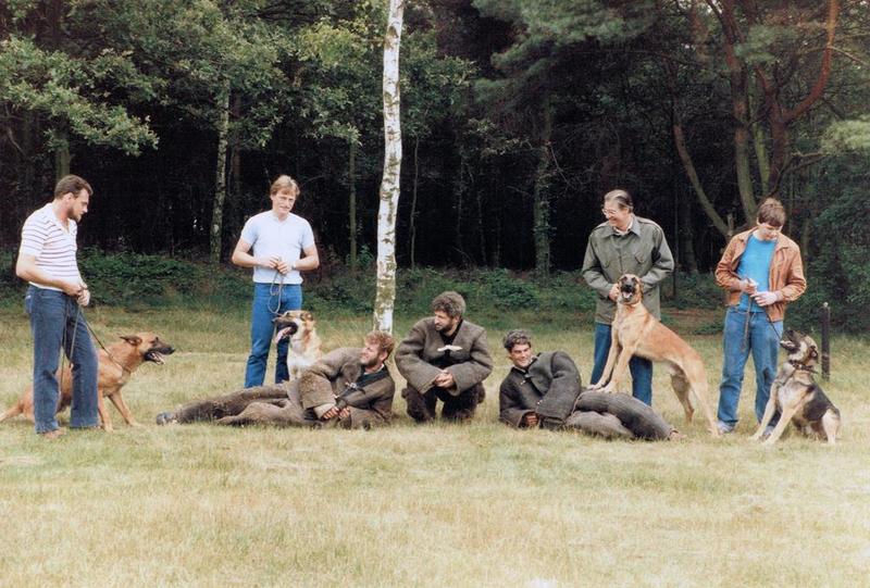 In 1984 nam de politiehondenvereniging een prachtig gelegen nieuw terrein tussen Reuver en Beesel in gebruik. Op de foto leden van de vereniging in hun werkpak en met hun honden. |